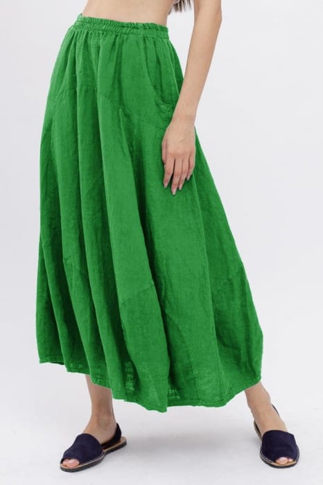 Fusta din in ampla, stil lalea, lunga, verde crud, cu buzunare mărime mare